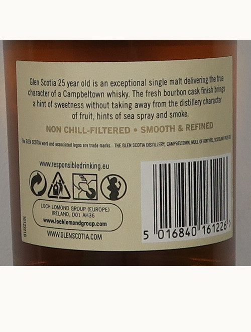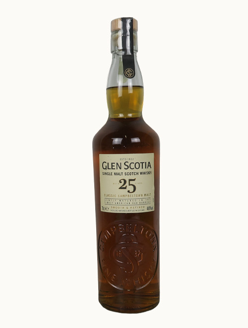 Le Glen Scotia 25 ans est un single malt vieilli 25 années avant d’être embouteillé à 48,8 % vol., sans coloration ajoutée et sans filtration à froid.