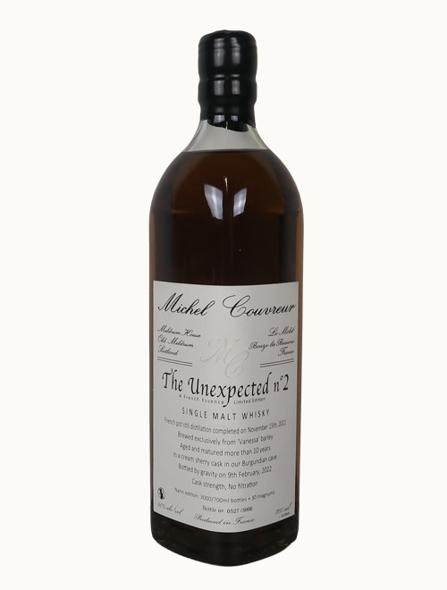 Le The Unexpected N°2 est un single malt français singulier et audacieux, distillé à partir d’orge Vanessa, vieilli plus de 10 ans en fûts de Xérès (cream sherry) et embouteillé à 50 % vol. sans réduction artificielle. C’est une cuvée en édition limitée (~3000 bouteilles) qui séduit par sa richesse et sa complexité aromatique.