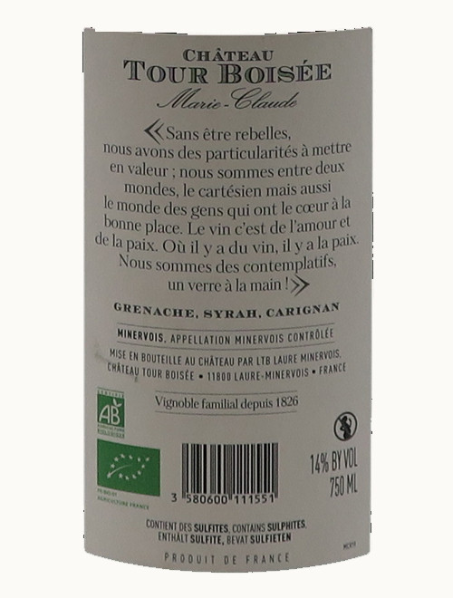 Château Tour Boisée est un domaine situé dans l’appellation Minervois, dans le sud de la France — territoire de Languedoc. Le domaine est réputé pour ses terroirs argilo‑calcaires et ses vignes souvent travaillées en agriculture biologique, ce qui donne des vins généreux, ancrés dans le caractère méditerranéen de la région.
